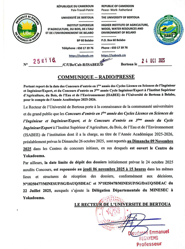 Communiqué – radio/presse portant report de la date des concours d’entrée en 1ère année des cycles licence en sciences de l’ingénieur et ingénieur/expert, et du concours d’entrée en 3ème année cycle ingénieur/expert à l’Institut Supérieur d’Agriculture, du Bois, de l’Eau et de l’Environnement (ISABEE) de l’Université de Bertoua à Bélabo, pour le compte de l’année…