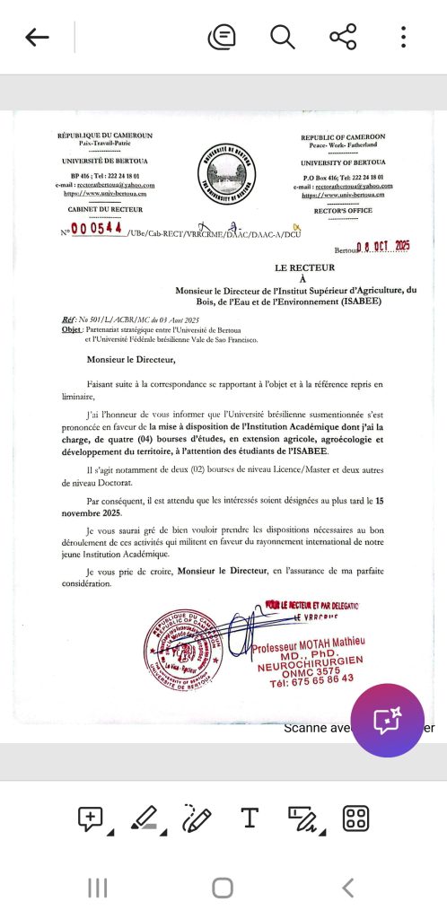 Le Recteur de l’Université de Bertoua porte à la connaissance de la communauté universitaire et le public qu’il est ouvert à l’Institut Supérieur d’Agriculture, du Bois , de l’Eau et de l’Environnement (ISABEE) de l’institution dont il a charge, au titre de l’Année Académique 2025-2026, l’admission en première année du Cycle de Master Recherche en…
